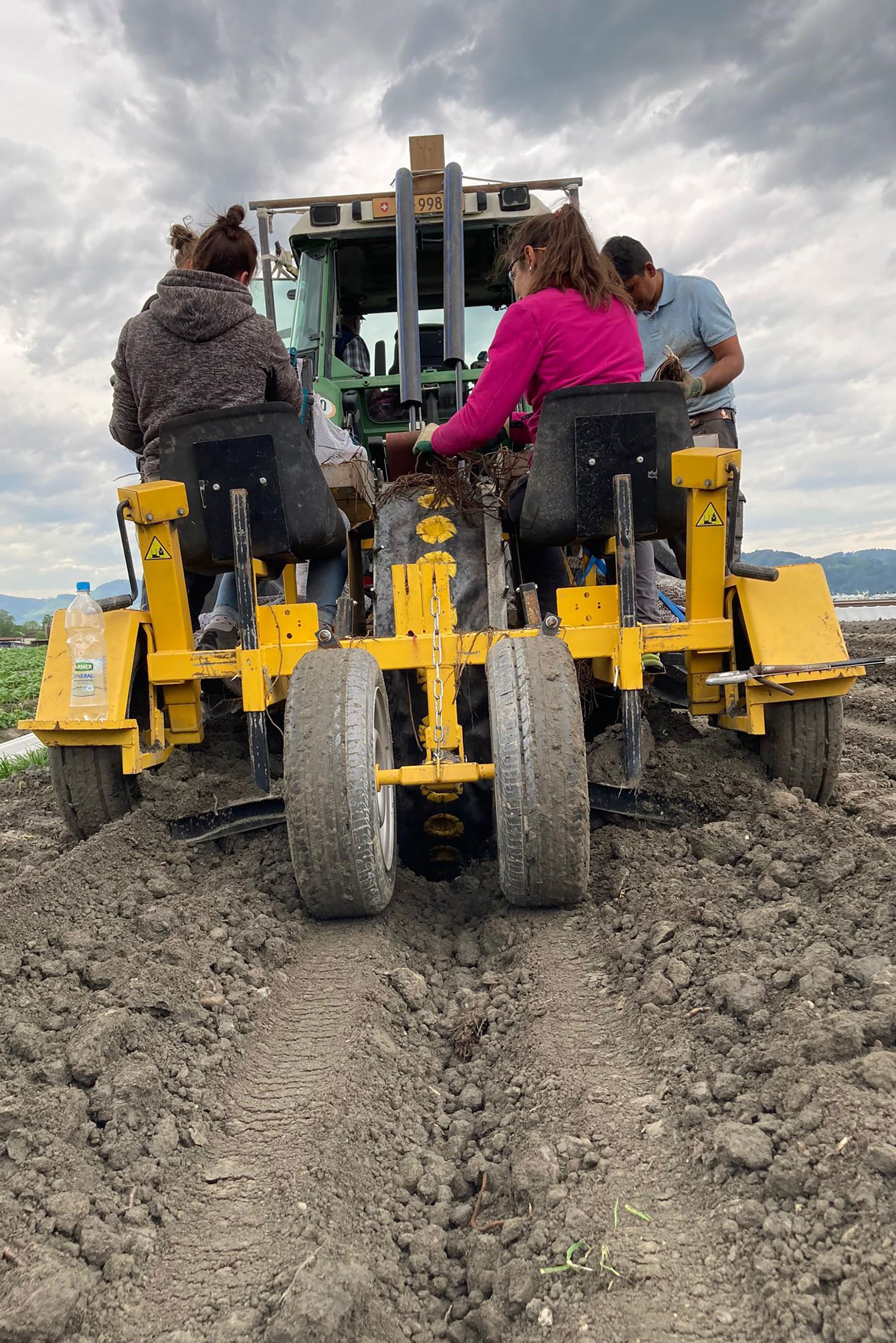 Zur Umsetzung dieser raffinierten Idee setzt Kummer bereits seit zehn Jahren auf speziell gehaspelte Trinkwasserrohre von Jansen. Im Mai 2021 wurden erneut 17 Kilometer Kunststoffrohre verlegt. Sämtliche Arbeitsschritte hat Fabian Kummer selbst erledigt: das Verschweissen und Verlegen der Rohre sowie die dazu benötigten Grabarbeiten. Die Kunststoffrohre und Spargelsetzlinge wurden gleichzeitig mit der Spargelsetzmaschine in das Feld gepflügt. Die Herausforderung dabei war das wechselhafte Wetter. Damit die Spargeln nicht verderben, darf es nicht regnen oder zu kalt sein.