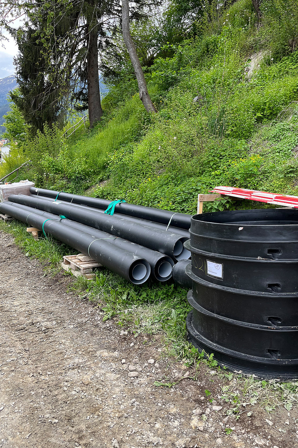 Über 1000 Meter Entwässerungs- sowie Kanal-Sickerrohre plus Schutzschächte. Das Gebiet ‘Plaun’ mit seiner beliebten Skipiste liegt auf 1630 Meter unterhalb des bekannten ‘Crap Sogn Gion’ (2228 Meter). Das steile Gelände mag Skisportler und Wanderer begeistern, für eine Installation für Rohrleitungen von über einem Kilometer ist es jedoch eine veritable Herausforderung.