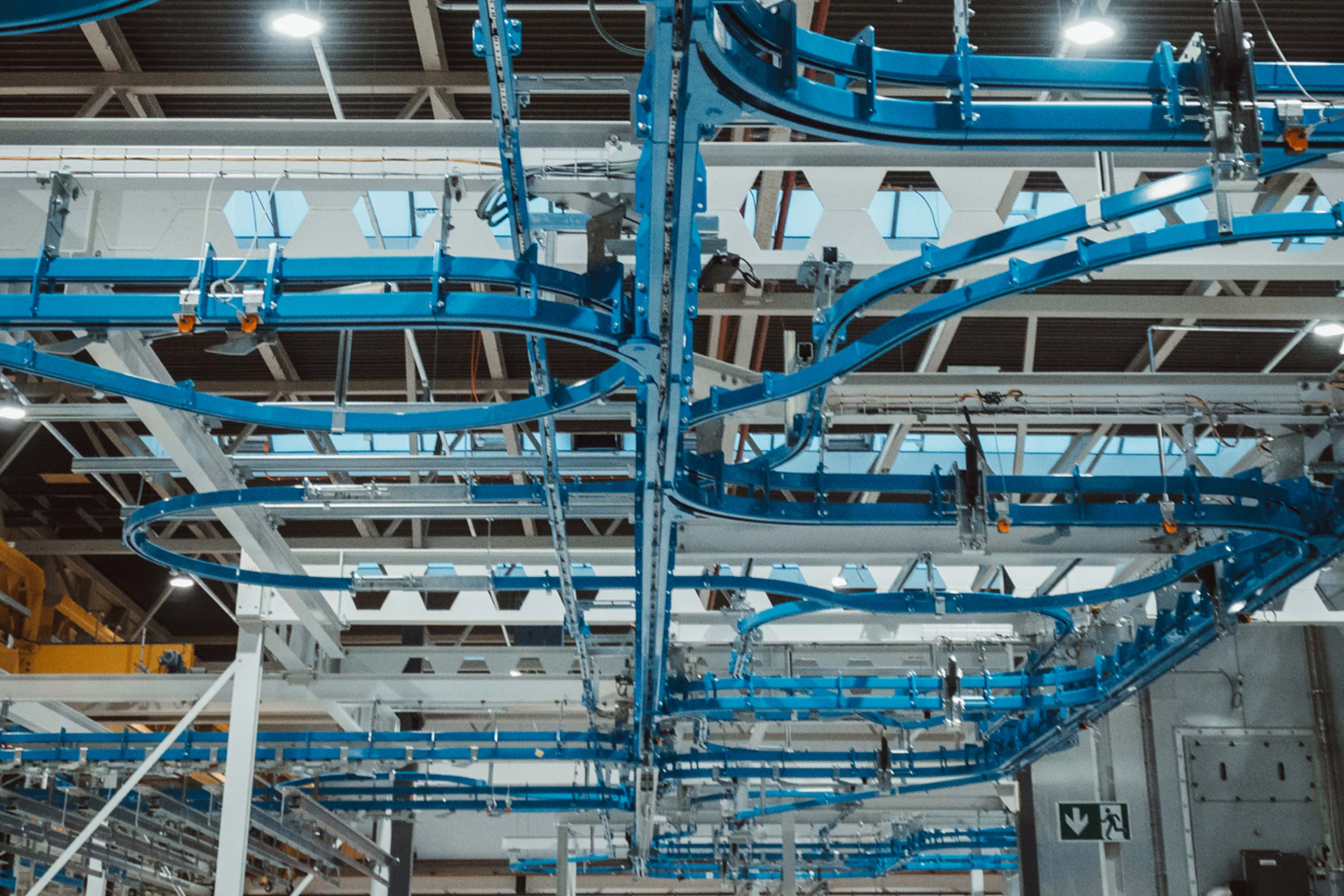 - Sistema di trasporto di 1.783 metri - flusso continuo di materiale per pezzi fino a 7.000 x 2.200 x 1.000 mm / 300 kg, con tamponi dinamici per processi senza interruzioni.