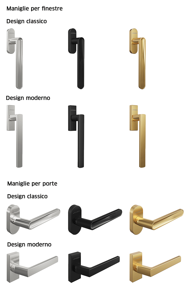 Design coerente per porte e finestre. Sia che si tratti di nuove costruzioni o di ristrutturazioni, la maniglia extra sottile di Jansen unisce estetica e funzionalità. Realizzata in acciaio inox di alta qualità, piacevole al tatto e testata per garantire un funzionamento duraturo: 20.000 cicli per le finestre, 200.000 cicli per le porte. Rosette particolarmente sottili e blocco a 90° per profili in acciaio raffinati – unici sul mercato. Con queste maniglie e rosette si crea un'immagine visivamente accattivante degli elementi. Le diverse varianti di colore consentono configurazioni personalizzate.