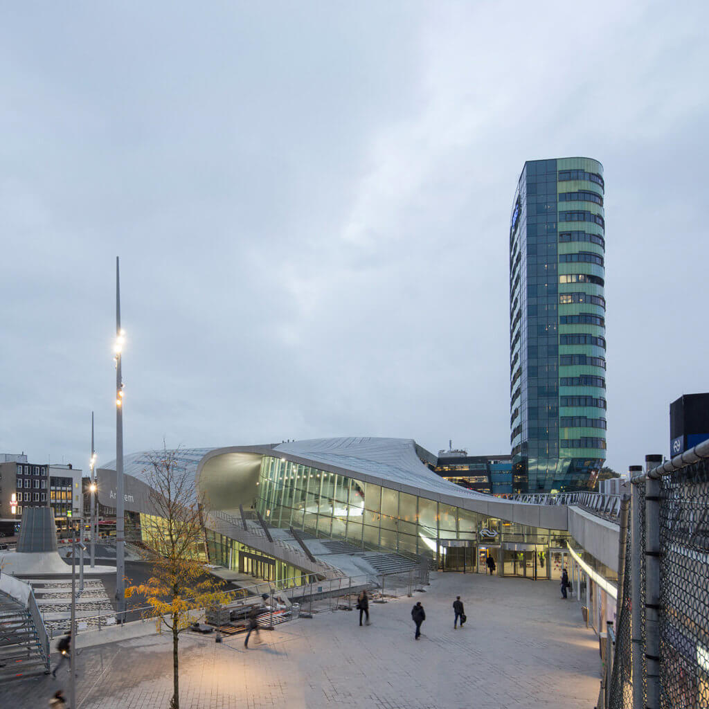 Rund 20 Jahre dauerte die Umgestaltung des Centraal Station Arnheim zur "Transfer Zone Arnheim" nach dem Stadtentwicklungsplan von UN Studio, Amsterdam. Seit der Fertigstellung der "Transferhalle" im November 2015 sind hier sechs verschiedene Verkehrssysteme - Bahn, Regional- und Oberleitungsbusse, Auto, Taxi und Fahrrad - benutzerfreundlich miteinander vernetzt. Die futuristisch anmutende Transferhalle beherbergt sämtliche Bahnhofs-funktionen und ersetzt auch den Vorplatz. Ihre fliessende Form resultiert aus der Analyse der unterschiedlichen Fortbewegungsarten der täglich rund 55'000 Nutzer. Ziel war es, die Wege mit den meisten Transferbewegungen so kurz wie möglich und frei von Kreuzungen zu gestalten. Die Topografie des Geländes, die einen Höhenunterschied von drei Metern aufweist, begünstigte die Anordnung der verschiedenen Verkehrsströme auf zwei Ebenen unter einem weit gespannten Dach.
